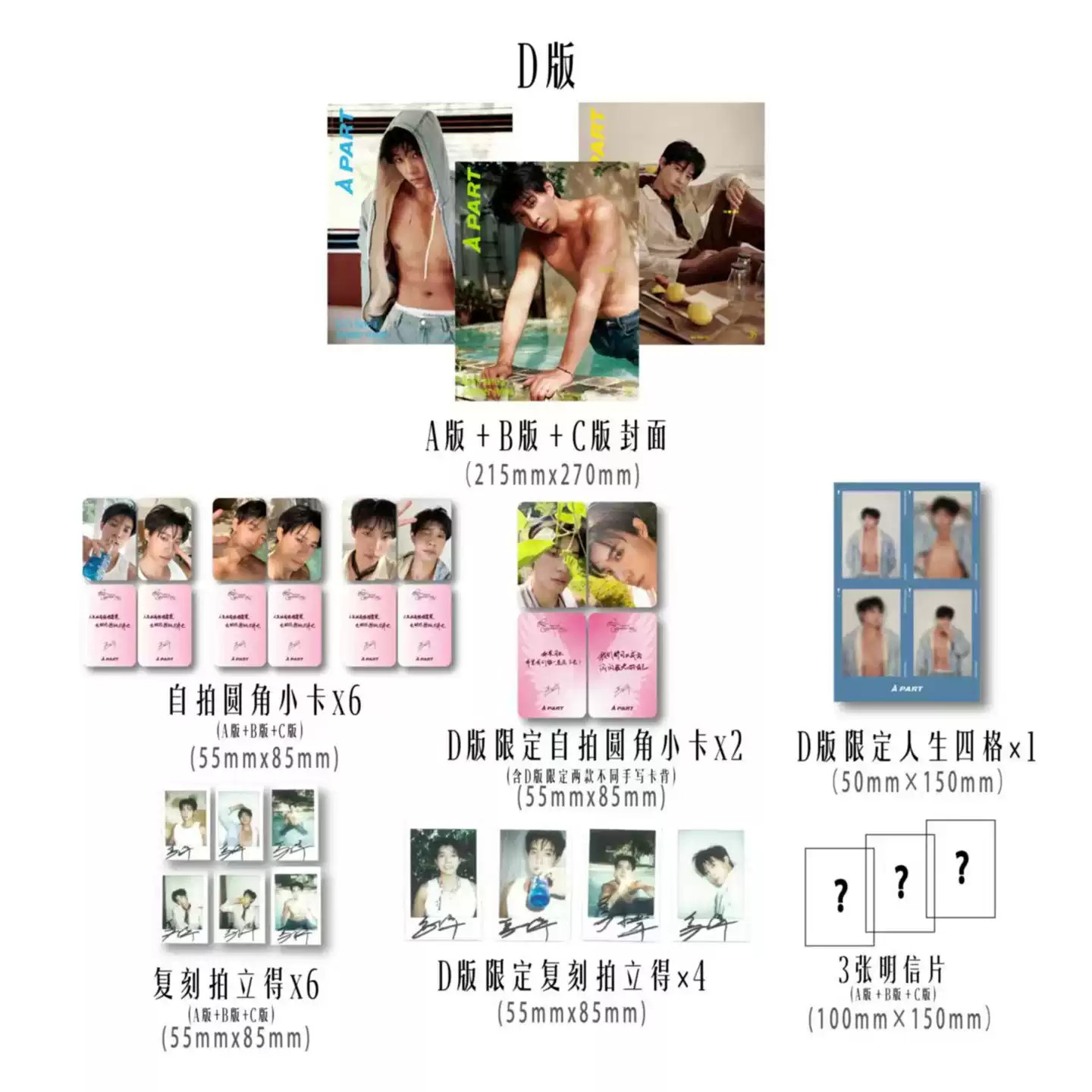 雑誌3冊+自撮りフォトカード8枚(ABCD版各2枚)+D版限定「人生四格」カード1枚+印刷サイン入りポラロイドカード10枚(ABC版各2枚+D版限定4枚)+ポストカード3枚(ABC版各1枚)