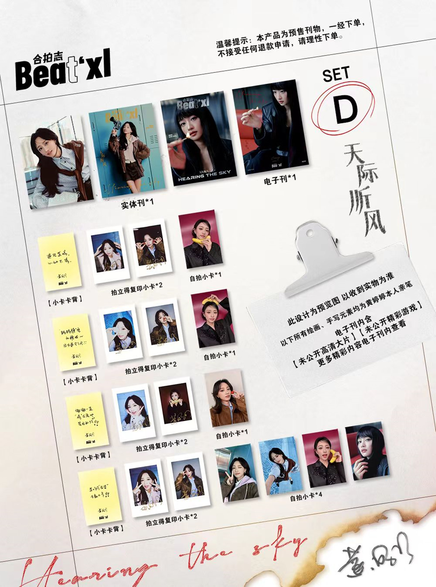 雑誌3冊+印刷サイン入りポラロイドカード8枚(ABCD版各2枚)+自撮りフォトカード7枚(ABC版各1枚+D版4枚)