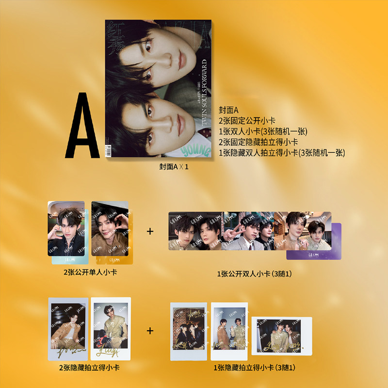 雑誌1冊+A版単人フォトカード2枚+双人フォトカード1枚(3枚からランダム)+A版印刷サイン入りポラロイドカード2枚+ポラロイドカード1枚(3枚からランダム)