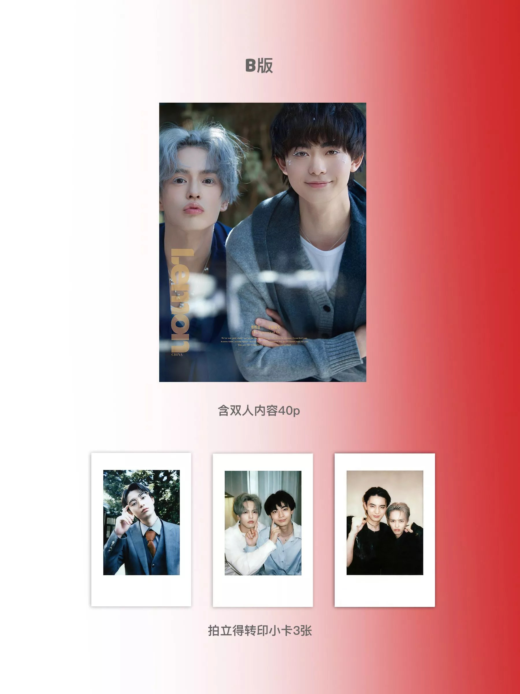 >>新春A版はこちら >>新春B版はこちら >>新春典蔵版2冊セットはこちら こちらは新春典藏版B版の雑誌セット: 雑誌1冊+B版ポラロイドカード3枚 B版表紙:奥野壮(おくのそう)&豊田裕大(とよだゆうだい)1冊 ※雑誌社の公式Weiboより(ご参考資料) ※実際の記事写真とは異なる場合がございます。予めご了承下さい。