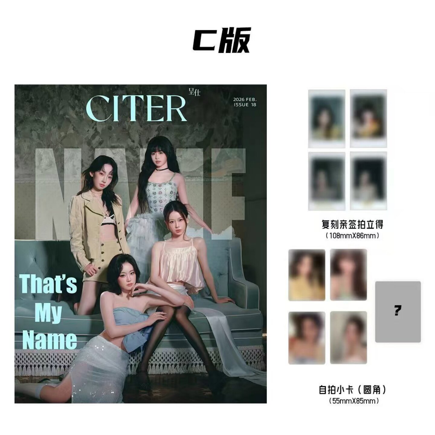 こちらはC版の雑誌セット(雑誌1冊+公式カード8枚)です。 C版表紙:NAME組合(龍韵竹、欧陽澄汐、劉嘉欣、李思陽)1冊 公式特典:C版ポラロイドカード4枚+C版フォトカード4枚 ※現地発売予定日:2-3月(予約商品です) ※発送予定:ご注文後60日以内をめどに発送の予定です。