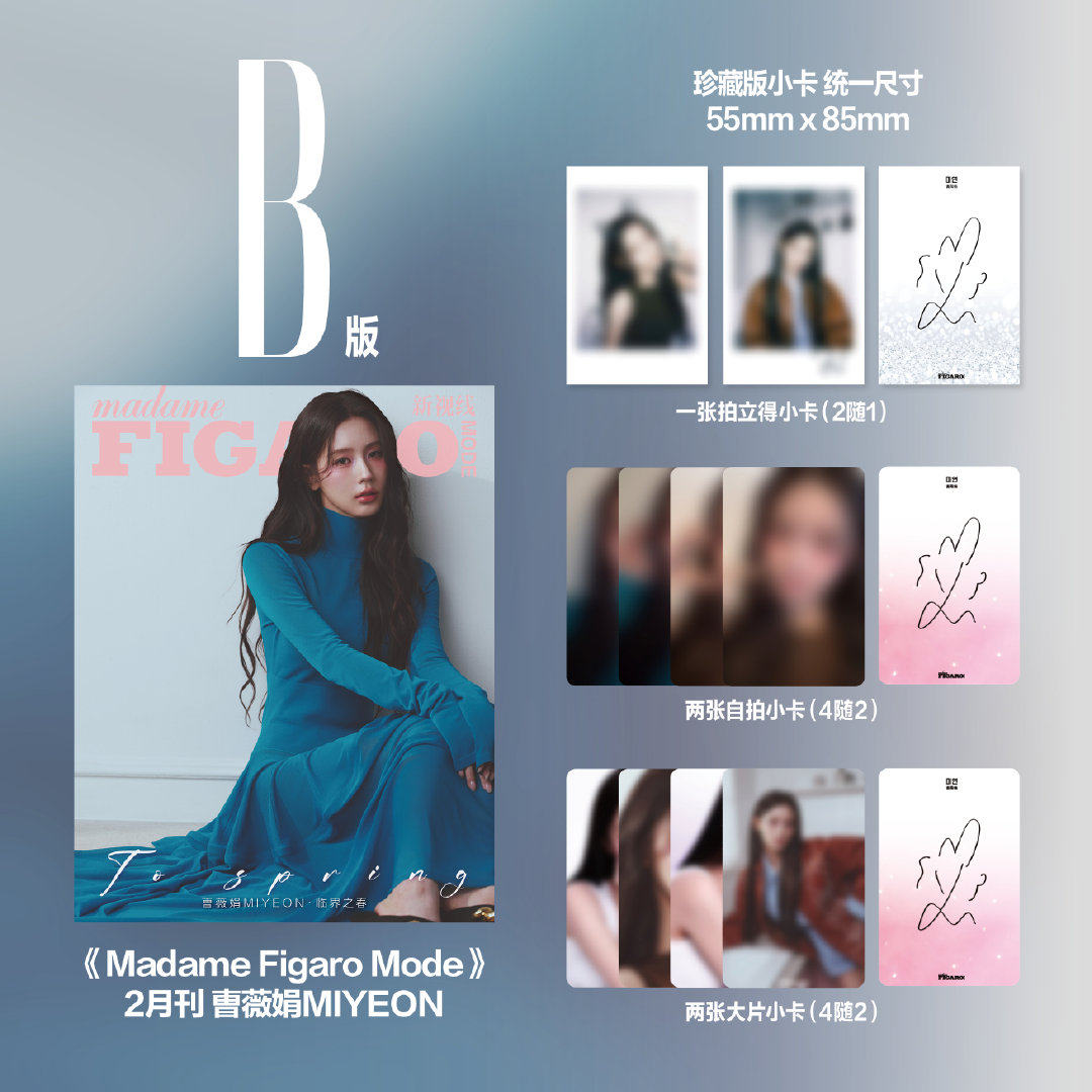 >>A版はこちら >>B版はこちら >>AB版2冊セットはこちら こちらはB版の雑誌セット: 雑誌1冊+印刷サイン入りポラロイドカード1枚(2枚からランダム)+自撮りフォトカード2枚(4枚からランダム) B版表紙:ミヨンMIYEON/i-dle 1冊 ※雑誌社の公式Weiboより(ご参考資料) ※実際の記事写真とは異なる場合がございます。予めご了承下さい。