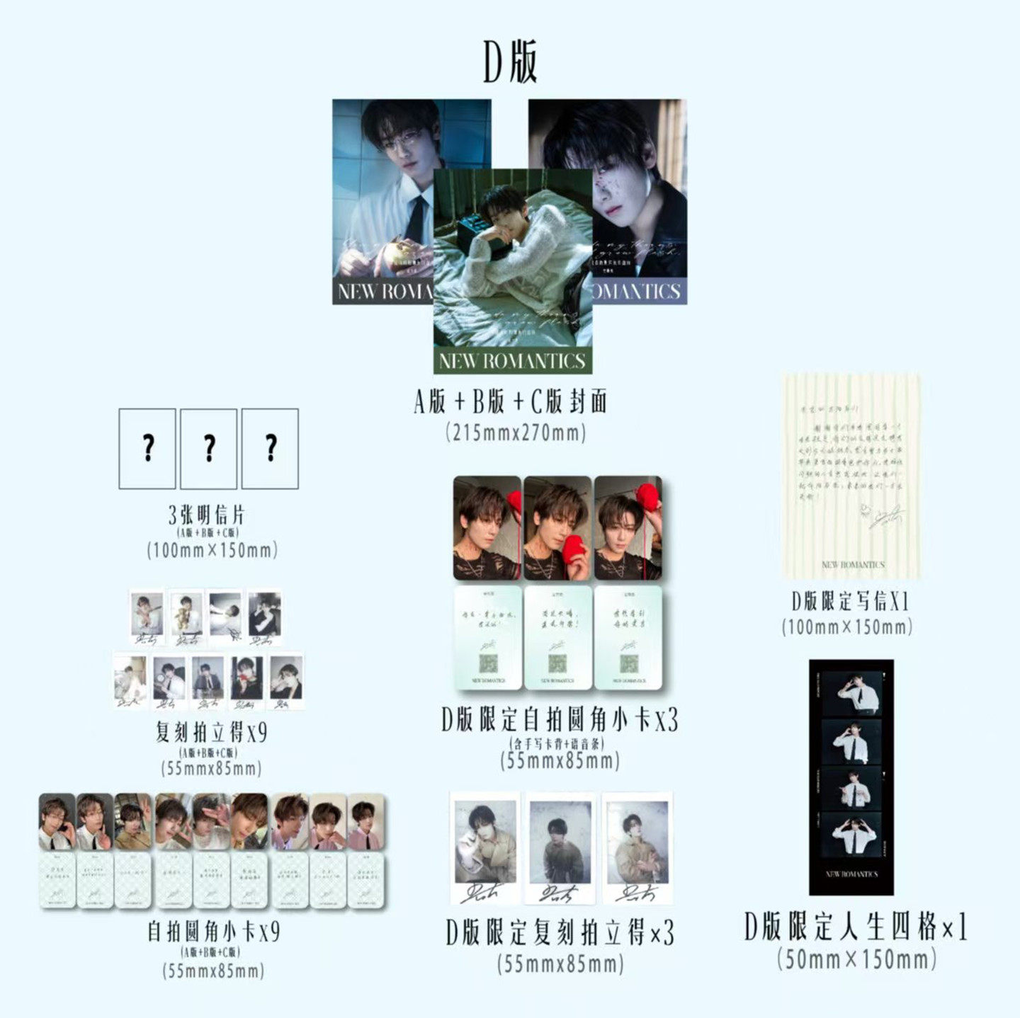 雑誌3冊+印刷サイン入りポラロイドカード9枚+自撮りフォトカード9枚+D版限定フォトカード3枚+D版限定印刷サイン入りポラロイドカード3枚+D版限定写信カード1枚+D版限定人生四格カード1枚