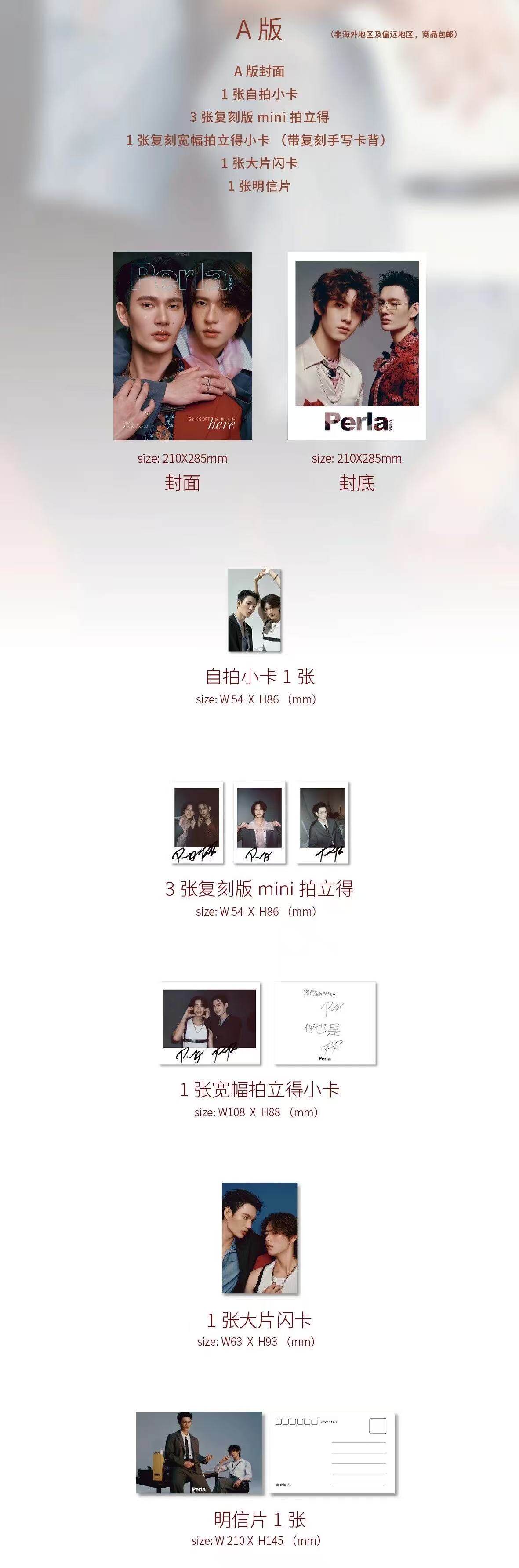 A版自撮りフォトカード(5.4cm x 8.6cm)1枚+印刷サイン入りポラロイドカード縦(5.4cm x 8.6cm)3枚+A版印刷サイン入りポラロイドカード横(10.8cm x 8.8cm)1枚+A版キラカード(6.3cm x 9.3)1枚+A版ポストカード(21cm x 14.5cm)1枚(封底は裏面の意味です)