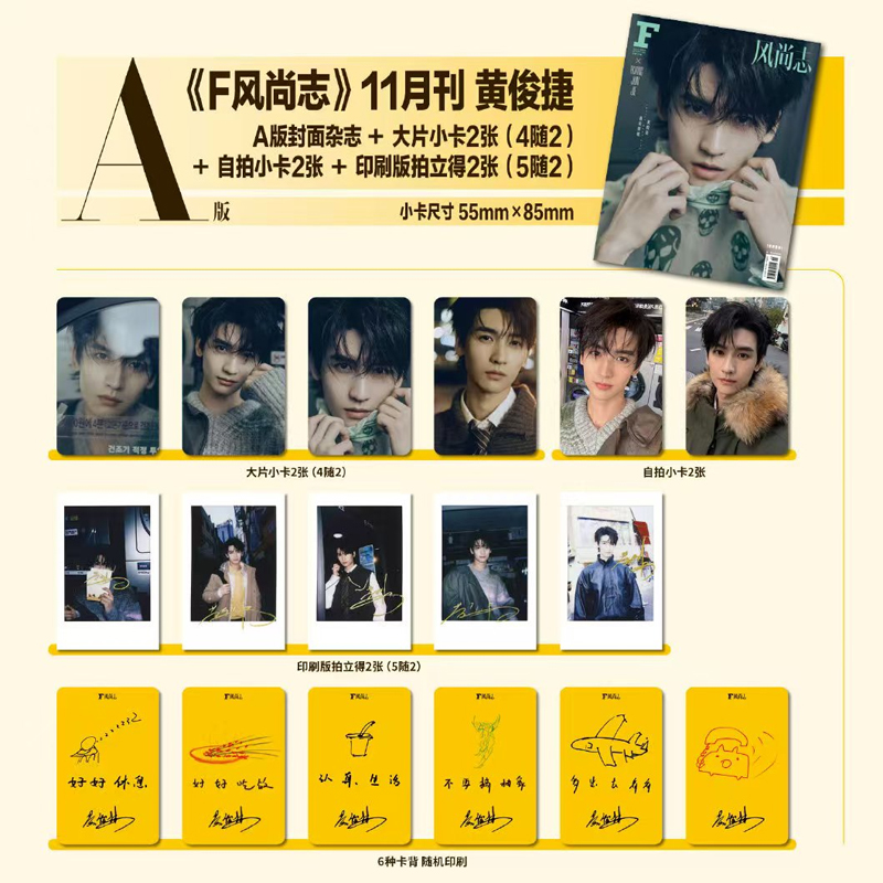 こちらはA版の雑誌セット(雑誌1冊+公式カード6枚)です。 A版表紙:ホアン・ジュンジエ(黄俊捷)1冊 公式特典:A版印刷サイン入りポラロイドカード2枚(5枚からランダム)+A版フォトカード2枚(4枚からランダム)+A版自撮りフォトカード2枚