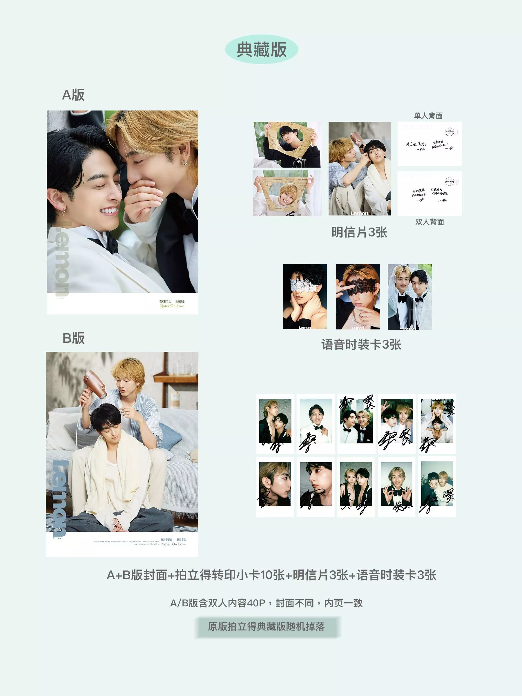 雑誌2冊+ポストカード3枚+語音カード3枚+印刷サイン入りポラロイドカード10枚(AB版各3枚+典藏版4枚)