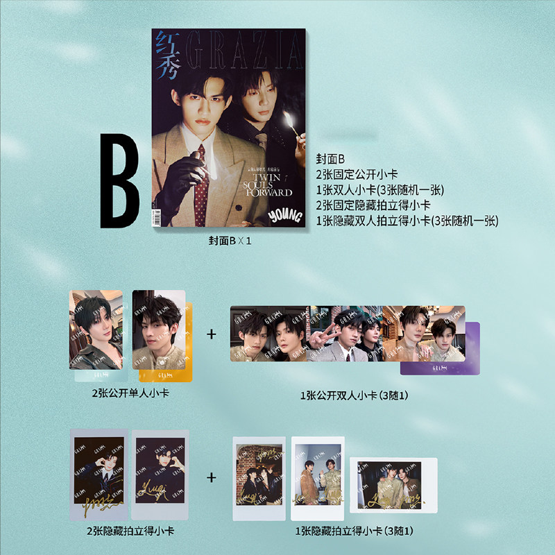 雑誌1冊+B版単人フォトカード2枚+双人フォトカード1枚(3枚からランダム)+B版印刷サイン入りポラロイドカード2枚+ポラロイドカード1枚(3枚からランダム)