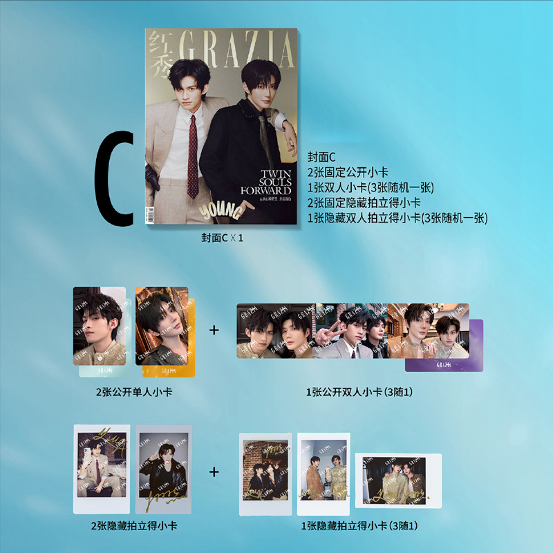 雑誌1冊+C版単人フォトカード2枚+双人フォトカード1枚(3枚からランダム)+C版印刷サイン入りポラロイドカード2枚+ポラロイドカード1枚(3枚からランダム)