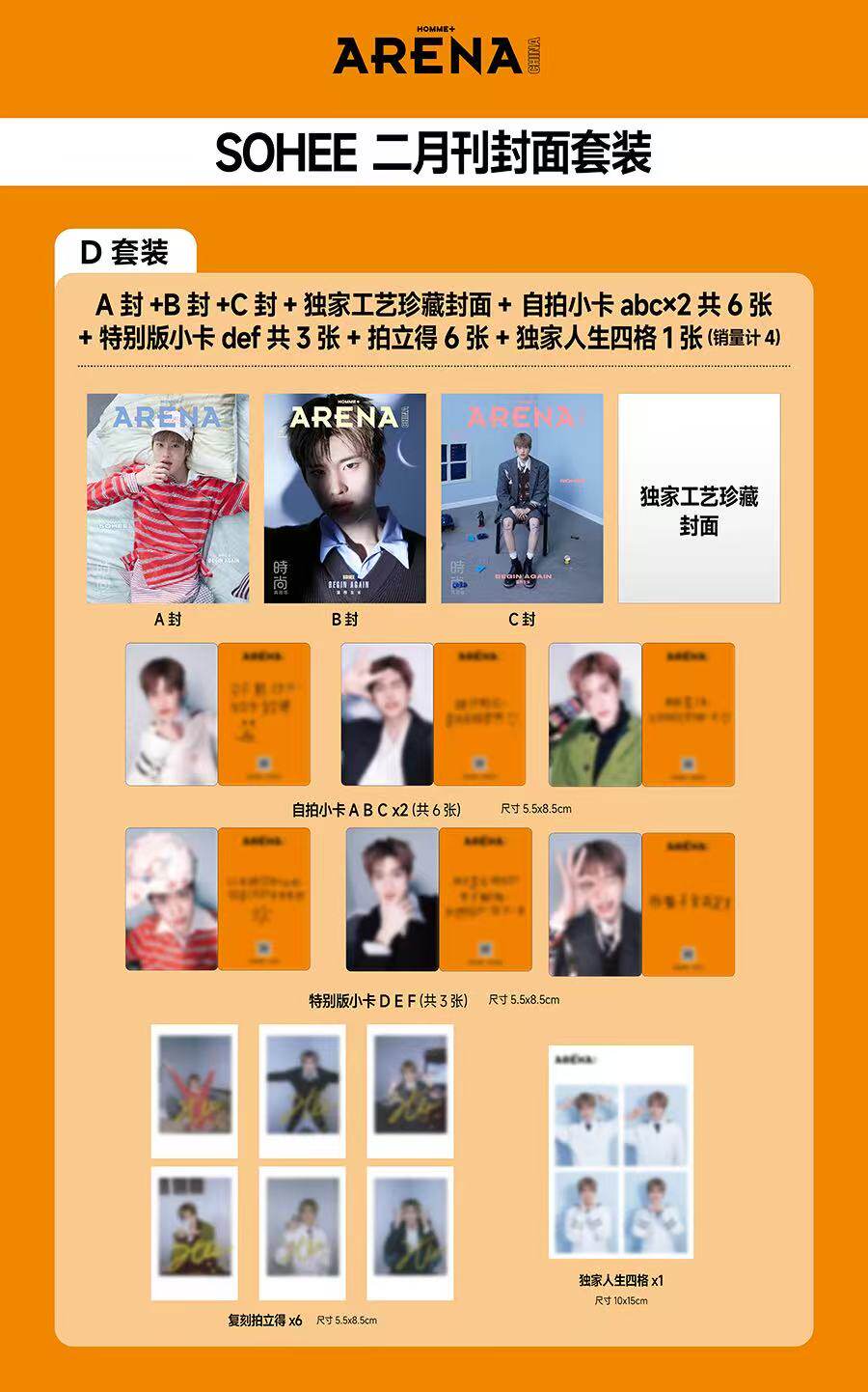ABC封面各1冊+特別版1冊+自撮りフォトカード6枚(ABC3枚を2セット)+特別版フォトカード3枚(DEF)+印刷サイン入りポラロイドカード6枚(ABC版各1枚+D版3枚)+D版人生四格カード1枚