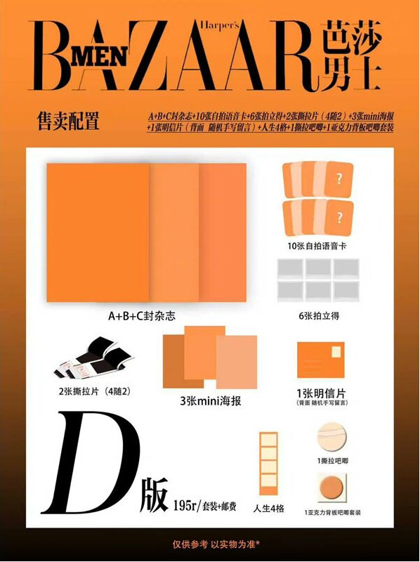 雑誌3冊+自撮り語音フォトカード10枚(ABC版各3枚+D版1枚)+ポラロイドカード6枚(ABC版各2枚)+ミニポスター3枚(ABC版各1枚)+D版ポストカード1枚+D版ポラロイド撕拉片2枚(4枚からランダム)+人生4格カード1枚+撕拉バッジ1枚+アクリル背板バッジ套装1枚