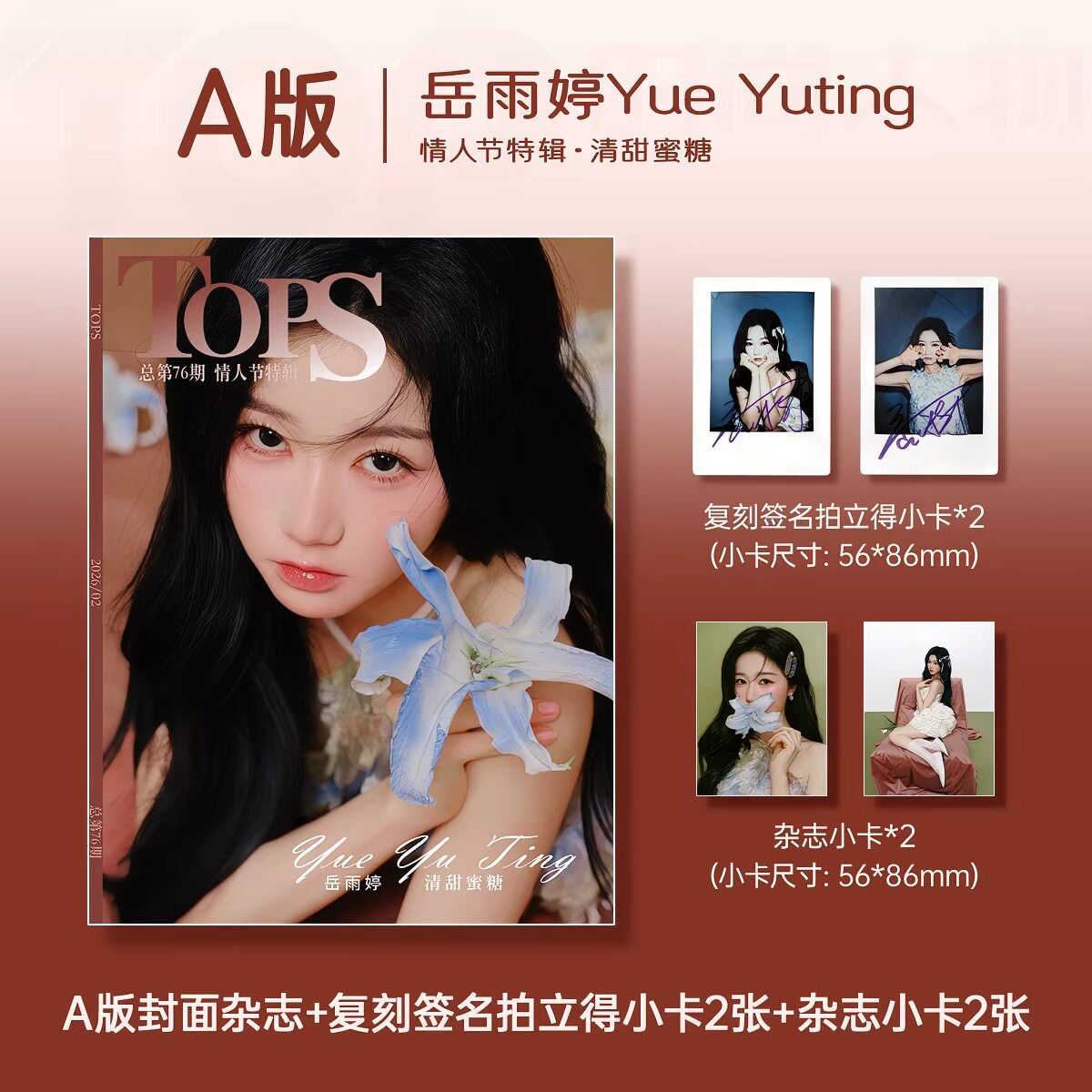 こちらはA版の雑誌セット(雑誌1冊+公式カード4枚)です。 A版表紙:岳雨婷(ユエ・ユーティン)1冊 公式特典:A版サイン入りポラロイドカード2枚+A版フォトカード2枚 ※現地発売予定日:4月(予約商品です) ※発送予定:ご注文後30日以内をめどに発送の予定です。